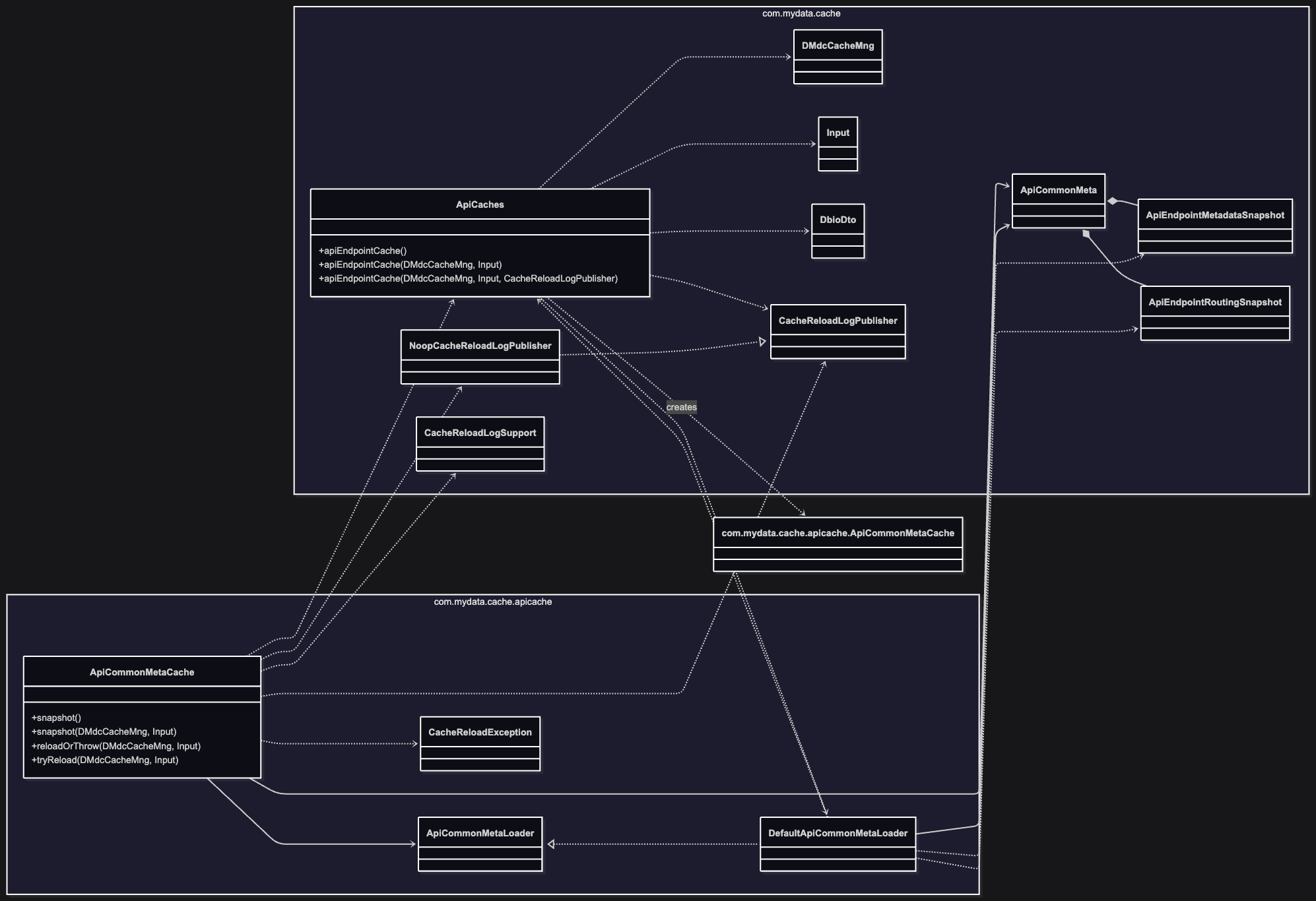 ApiCommonMeta loaded = loader.loadSnapshot(dMdcCacheMng, input); // 호출 시점 파라미터로 전체 스냅샷을 읽는다.