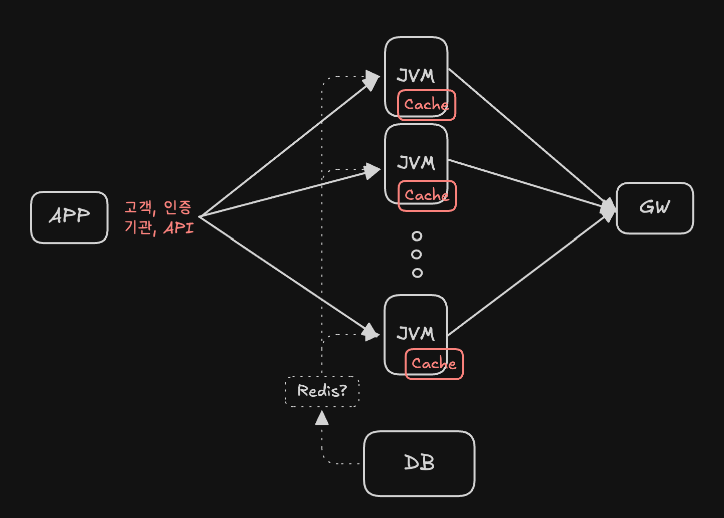 이런 상황에서, 매 호출 마다 DB 에서 정보를 가져오는 것은 매우 비효율적이다. 그렇다고 모든 명세와 메타정보를 하드코딩 하기에는 빈번히 변경되는 API 규격과 실시간 인증처리에 대응이 불가능 하다. 따라서 자주 조회하는 정보는 캐시로 들고 있고, 변경점이 발생 할 경우 이를 주기적으로 갱신하는 방식이 효율적이라고 판단했다.