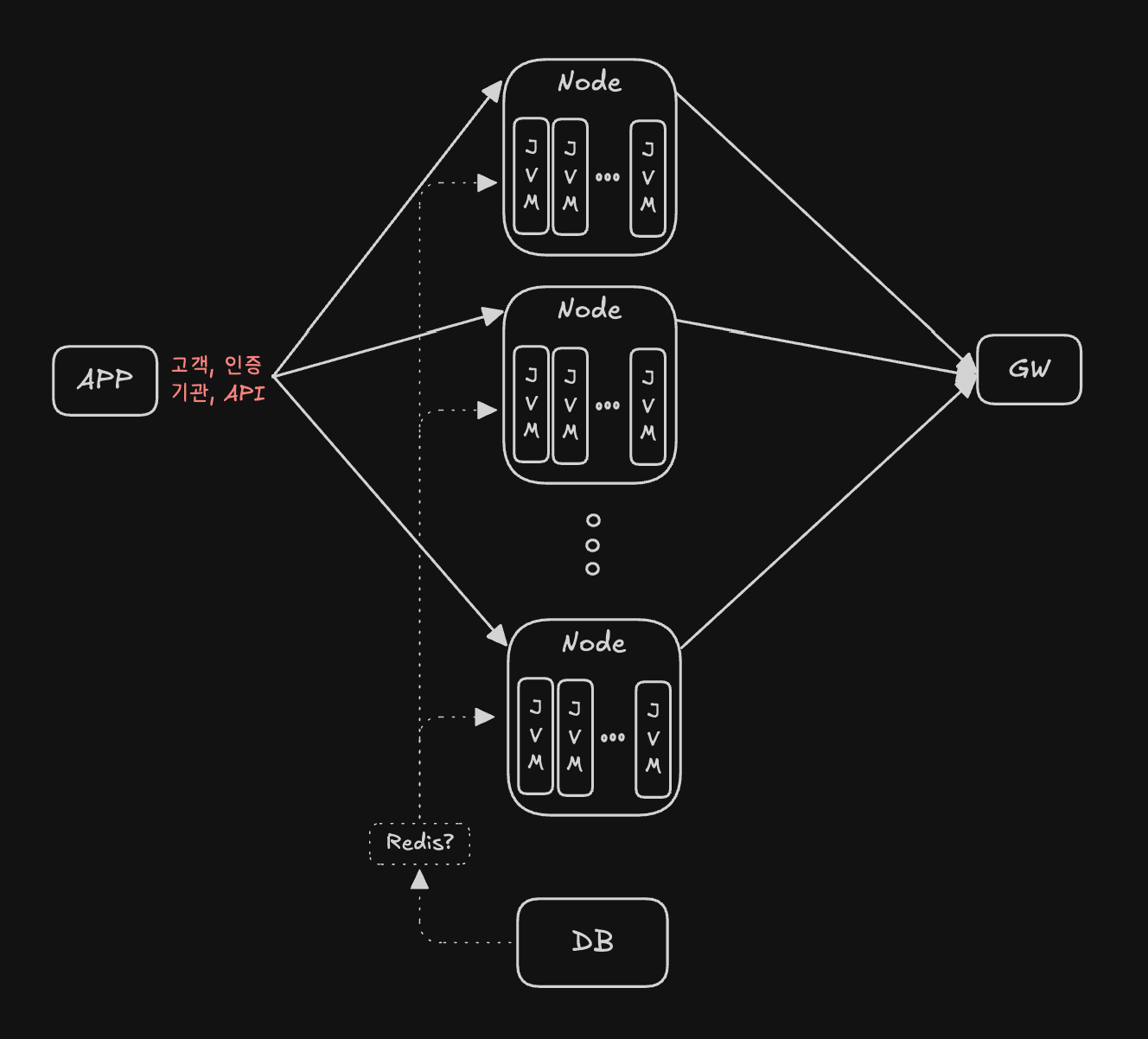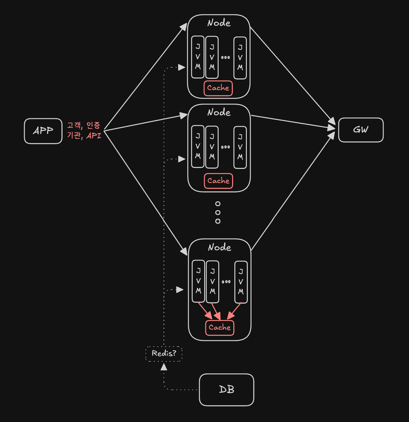 가장 일반적이고 간단한(?) 방법은 In-memory 기반의 Redis 같은 캐시 클러스터를 구축해 사용하는 것이였다. 이는 Multi-Node 로 구성된 서버들과 주기적으로 업데이트 되는 정보를 공유하기 유리 하다. 이미 안정성과 사용성도 검증되었기 때문에 운영하는 데에 큰 이슈도 없어보였다. 하지만 결국은 Redis Cluster 를 별도로 관리해야 하는 어려움과, 현재 WebtoB-Jeus 솔루션에 Redis의 연동을 정상적으로 진행하기 위해서는 필요한 인프라 레벨의 버저닝을 일치시키는 작업이 수반되었고, 무엇보다 굳이 각 jvm 간에 메타데이터 Sync를 일치시킬 필요성은 없었다.